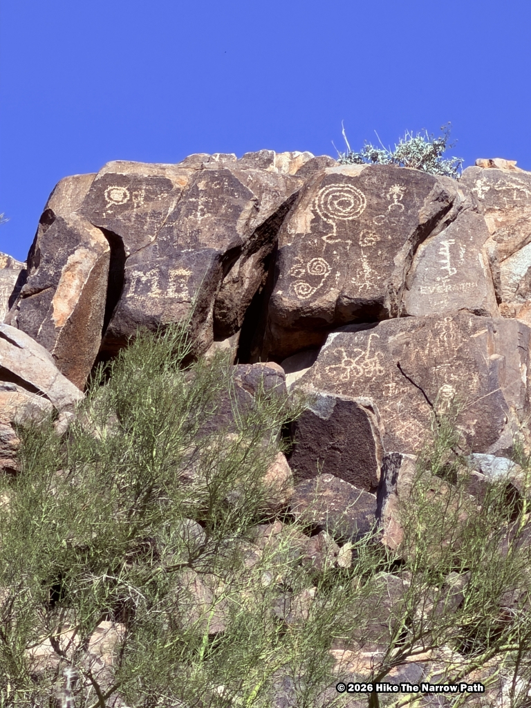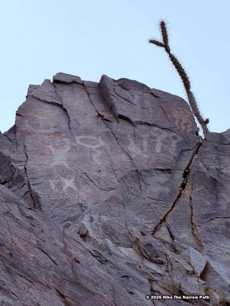 Our first stop was the King Canyon Trail, creating a 2.4 mile moderate loop:King Canyon Wash Trail to Sendero Esperanza Trail from the initial junction and returning via Gould Mine Trail. This loop started with a lot of gravel in the wash, it had cacti throughout the loop, and even rock scrambling. Additionally, we were able to find some petroglyphs along the way. By the time we left, the lot was completely full.