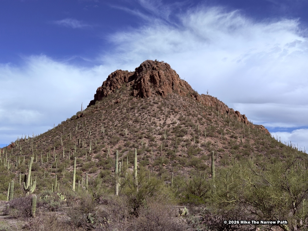 Next up was the easy Loma Verde/Pink Hill/Squeeze Pen 3.8 mile loop. Close to the trailhead, we saw something run across the trail that looked similar to a dog but we didn’t get a good glance at it. Later we heard the sound of what sounded like dogs howling; we’re fairly confident it was coyotes. We stopped at the Loma Verde Mine Site for a couple minutes. Throughout the trail, there were tons of birds, many pincushion cactus, and even some butterflies.